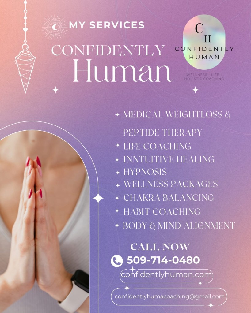 At Confidently Human, we combine science, spirituality, and soul-aligned transformation to help you heal, balance, and evolve from the inside out. Our integrated approach blends Intuitive Healing, Wellness & Spiritual Coaching, Hypnosis, and Medical Weight-Loss support through Peptides & GLP-1 therapy — empowering you to release old patterns, restore energetic harmony, and step fully into your highest potential.